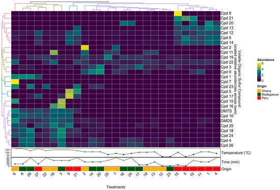 A clustered heatmap of scaled relative concentrations of the 28 VSCs detected in chocolate samples made from beans from three origins (Madagascar, Ghana, and Peru) and roasted at eight different times and temperatures according to an experimental design.