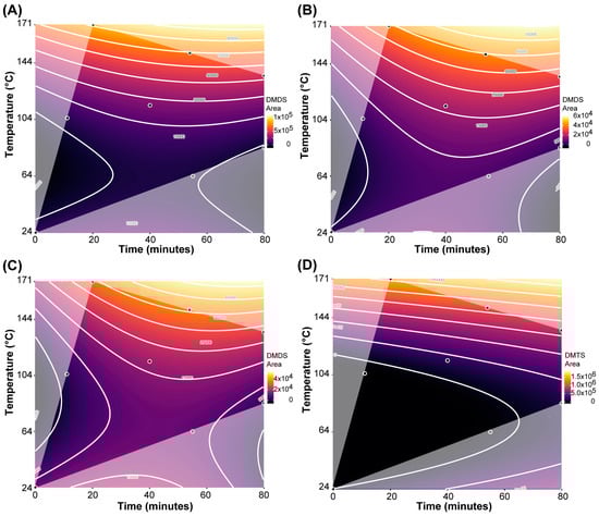 Response surface contour plots for dimethyl disulfide (DMDS) and dimethyl trisulfide (DMTS), as a function of roasting time and roasting temperature. (A) DMDS in samples from Ghana; (B) DMDS in samples from Madagascar; (C) DMDS in samples from Peru; (D) DMTS in samples across all three origins.