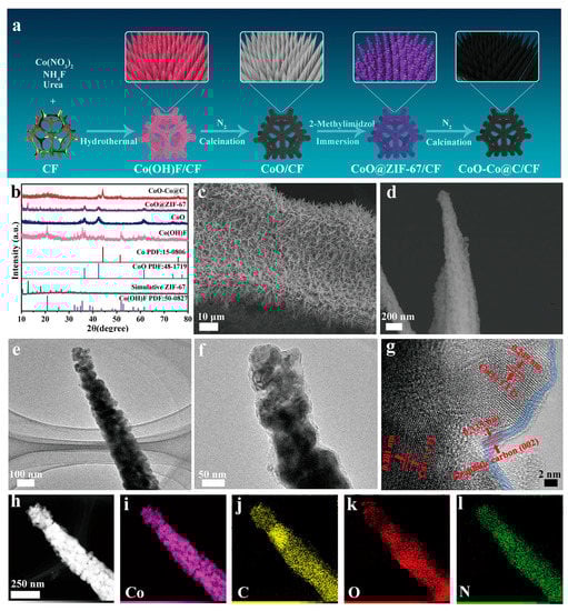 Schematic illustration of the synthetic procedure for CoO–Co@C/CF (a), XRD patterns of Co(OH)F, CoO, CoO@ZIF-67, and CoO–Co@C exfoliated from CF (b); SEM images (c,d), TEM images (e,f) and high-resolution TEM image (g), TEM-EDS element mapping images (h–l) of CoO–Co@C exfoliated from CF.