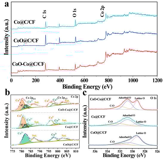 The elemental composition and valence states of CoO–Co@C/CF, Co@C/CF, and CoO@C/CF were analyzed by the X-ray photoelectron spectroscopy (XPS). Figure 2a compares the XPS survey spectra of CoO–Co@C/CF, Co@C/CF, and CoO@C/CF, which shows the existence of C, O, and Co elements in all samples. In the Co 2p spectrum of CoO–Co@C/CF (Figure 2b), the peaks at 780.2 eV and 795.9 eV can be assigned to metallic Co, the peaks at 782.6 eV and 798.1 eV belong to Co2+, and the peaks at 786.7 eV and 802.7 eV are satellites [25,46,47]. It is worth noting that, compared with metallic Co in Co@C/CF, a slight shift to the low binding energy occurs in the Co 2p XPS of CoO–Co@C/CF, while the binding energy of Co2+ in CoO–Co@C/CF slightly moves in a positive direction relative to that in CoO@C/CF, which signifies the strong electron interaction between metallic Co and CoO. The content of metallic Co decreases in the order of Co@C/CF > CoO–Co@C/CF > CoO@C/CF, which is exactly the opposite of the Co2+. Figure 2c compares the O 1s XPS of the three studied samples. The peaks at 529.2, 531.3, and 531.92 eV belong to the lattice oxygen, adsorbed oxygen, and carbon oxygen, respectively. Moreover, the content of lattice oxygen decreases with the increase of metal cobalt content. The results from XRD and XPS indicate the coexistence of CoO and Co in the CoO–Co@C/CF.