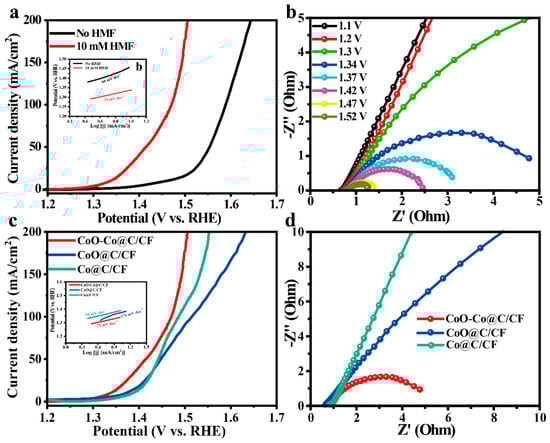 (a) iR-compensated polarization curves of HMFEOR over CoO–Co@C/CF in 1.0 M KOH with/without 10 mM HMF at the scan rate of 5 mV·s−1 (inset: corresponding Tafel plots). (b) Potential-dependent Nyquist plots of CoO–Co@C/CF in 1.0 M KOH with 10 mM HMF. (c) Polarization curves of HMFEOR over CoO–Co@C/CF, CoO@C/CF, and Co@C/CF in 1.0 M KOH with 10 mM HMF at the scan rate of 5 mV·s−1 (inset: corresponding Tafel plots). (d) Nyquist plots at 1.34 V of CoO–Co@C/CF CoO@C/CF, and Co@C/CF in 1.0 M KOH with 10 mM HMF.