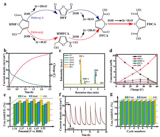 Generally, there are two possible pathways for HMFEOR [48,49]. In the first step, the aldehyde group of HMF is oxidized to yield 5-hydroxymethyl-2-furancarboxylic acid (HMFCA), or the hydroxyl group of HMF is oxidized to yield 2,5-diformylfuran (DFF) (Figure 4a). Subsequently, two intermediates (HMFCA and DFF) are further oxidized to 5-formyl-2-furancarboxylic acid (FFCA) and finally to FDCA. The polarization curves of CoO–Co@C/CF towards various biomass (HMF, HMFCA, DFF, FFCA, or FDCA) oxidation are depicted in Figure S10. By comparison, the catalytic ability of CoO–Co@C/CF towards HMF and intermediates (HMFCA, DFF, and FFCA) is superior to that towards FDCA. In order to identify the reaction pathway of HMFEOR, the chronoamperometry experiments were carried out at a constant potential of 1.37 V vs. RHE and the content of reactants/products was quantified by the standard curves determined by the high-performance liquid chromatography measurements (HPLC) (Figures S11–S15). Theoretically, owing to the complex six-electron transfer, a charge of 58 C is required to convert the HMF (10 mM, 10 mL) into FDCA completely, which can be implemented by applying a potential of 1.37 V vs. RHE for 2.4 h (Figure 4b). The superficial evidence from the color change of the electrolyte suggests the conversion from HMF to FDCA (Figure S16). As shown in Figure 4c, the HPLC signals of HMF and FDCA display a diametrically opposite trend with the prolonging of the reaction time, demonstrating the gradual conversion from HMF to FDCA. When the charge reaches 58 C, the HPLC signal of HMF disappears, while that of FDCA increases to the maximum. It is worth noting that there is no response of DFF in HPLC, illustrating that the implementation of HMFEOR on CoO–Co@C/CF goes through HMF → HMFCA → FFCA→ FDCA. According to the standard curves, the concentration changes of HMF, DFF, HMFCA, FFCA, and FDCA during the electrolysis are depicted in Figure 4d. CoO–Co@C/CF delivers an excellent catalytic activity with the HMF conversion of 100%, FDCA yield of 99.4%, and FE of 99.4%. Different potentials (from 1.34 V to 1.52 V) were applied to HMF conversion with the constant charge of 58 C. With the increase in applied potentials, the time required for HMF oxidation is significantly reduced (Figure 4e and Figure S17). Furthermore, when the applied potential increases to 1.52 V vs. RHE, the decline in HMF conversion, FDCA yield, and FE is obvious and some bubbles were produced on the surface of working electrode, which indicates that part of the charges have been used for water oxidation. The electrolysis cycles (at a constant potential of 1.37 V vs. RHE) are continuously operated to investigate the stability and durability of CoO–Co@C/CF. During the multiple cycle tests, a nearly constant HMF conversion (100%), FDCA yield (99.4%), and FE (99.4%) can be achieved, manifesting the potential of CoO–Co@C/CF in practical applications (Figure 4g). CoO–Co@C/CF delivers a prominent ability of catalyzing HMFEOR, especially in the selectivity and FE, which ranks among the best Co-based catalysts reported so far (Table S2).