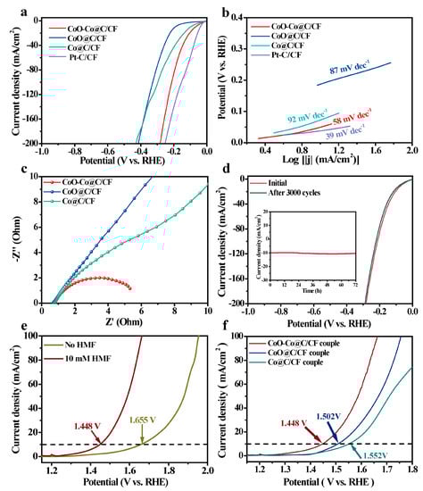 In view of the above considerations, the CoO–Co heterojunction arrays covered with carbon were designed and directly constructed on copper foam (CoO–Co@C/CF), which efficiently achieves the integration of HER and HMFEOR in an alkaline system. In the anode, CoO–Co@C/CF can catalyze HMFEOR to produce FDCA with a satisfying yield and a Faraday efficiency (FE) (>99%) at a low applied potential of 1.34 V vs. the reversible hydrogen electrode (RHE). In the cathode, the HER overpotential at 10 mA·cm−2 occurring on CoO–Co@C/CF is about 69 mV, accompanying a small Tafel slope of 58 mV·dec−1. Specifically, the electrolyzer assembled with CoO–Co@C/CF for the coupled H2 and FDCA production only requires a voltage of 1.448 V at 10 mA·cm−2, lower than that for water splitting (1.655 V at 10 mA·cm−2). We expect that the bifunctional two-electrode electrolyzer can couple HER with many other organic reactions for establishing a valuable electrochemical reforming system.