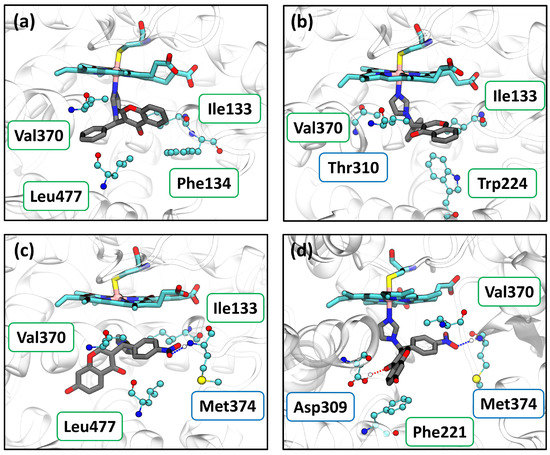 Representative structures as obtained from QM/MM molecular dynamics trajectories of the coordination complex between (a) R-3b, (b) S-3b, (c) R-4a, and (d) S-4a and AR active site. AR structure is displayed in silver new cartons, the heme moiety, Cys437, and the inhibitors are shown in licorice; the residues mostly contributing to the binding are shown in balls and sticks. Labels of residues forming hydrophobic and hydrogen bonding interactions are circled in green and blue, respectively.