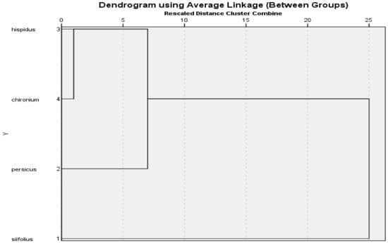Ten significant components (less than 1%) were chosen from the water-distilled essential oil components. For the four Opopanax species, these elements were submitted to cluster analysis using numerical taxonomic techniques. The UPGMA statistical approach and the IBM SPSS Statistics 21.0.0 software were both employed for this investigation. Dendrograms were used to show the findings of these analyses, and the results were assessed in terms of numerical chemotaxonomic connections. The relationships between the species are shown in the cluster analysis tree shown in Figure 1.