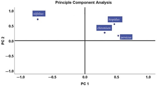 Based on previously published investigations, multivariate analysis was applied []. Both principal component analysis (PCA) and cluster analysis (CA) were used to determine the chemicals in the various samples. Then, using the matrix correlation setup, PCA was carried out using Varimax rotation. PC1 (50.96%) and PC2 (16.76%) were the two primary components of the principal component analysis, respectively. PC1 and PC2 carried a combined load of 67.72%. To investigate the correlation between the variables, the Kaiser–Meyer–Olkin (KMO) approach was used. The KMO value was 0.728, which is a respectable value. For the data set, Barlett’s test of sphericity likewise demonstrated a statistically significant difference at alpha of 0.04. The link between the four Opopanax species and their essential oil concentration was highlighted using PCA analysis, which was carried out using two different groups (PC1 and PC2). Figure 1, Figure 2 and Figure 3 show the results.