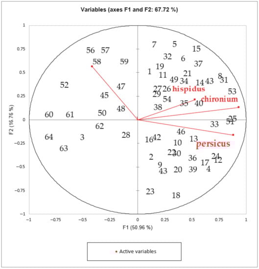 The promax rotation was then used to perform the PCA with the matrix correlation configuration. PCA was then performed in the XLSTAT 2022 software using the matrix type correlation configuration. The species’ proximity and distance from one another based on their essential oils’ content are discussed. “R” (Boston, MA, USA) was used to create biplot graphs (Figure 3).