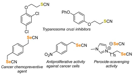 Simple organothiocyanates and organoselenocyanates, as depicted in Figure 1, have been reported to display a broad range of biological activities, ranging from chemoprevention [] and antiproliferative activity against cancer cells [] to peroxide scavenging [] and treatment of Chagas disease [,,]. Additionally, these compounds can be easily converted to other functional groups or employed in synthetic transformations [,,,].