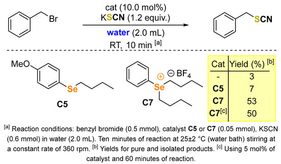 One major issue with the procedure using only water as a solvent is its reproducibility. Much more reliable results were found using a 20:1 mixture of water and dimethyl carbonate (DMC) as the solvent. DMC and benzyl bromide are denser than water, so they produce an organic substrate-rich phase, facilitating the mass transport process. Nevertheless, DMC is recognized as an environmentally friendly solvent []. The addition of 10 mol% of C7 to a flask containing benzyl bromide, 1.2 equivalents of KSCN in a 20:1 mixture of water and DMC produced much more product after 10 min than the uncatalyzed reaction (Table 2, entries 1 and 2). Increasing the amount of KSCN to 2.0 equivalents proved optimal, as the result obtained did not change even after extending the reaction time to 1 h (Entries 3 and 4). Catalytic activity was also observed when reducing the amount of C7 to 5.0 and 2.5 mol% (Entries 5 and 6 respectively). However, replacing benzyl bromide with benzyl chloride or iodide did not result in good yields (results not shown).