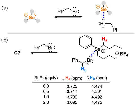 Evidence for the activation of benzyl bromide by the Lewis acidity of the selenonium salt C7 through a chalcogen bond interaction (Scheme 2a) was observed by 1H NMR. A small, but noticeable signal shift of hydrogen atoms (Ha) adjacent to the selenonium center was detected when benzyl bromide was added to a solution of C7 in CDCl3. Upon the addition of benzyl bromide, the chemical shift of those hydrogens became lower, as expected, and was directly dependent on the amount of Lewis base added (Scheme 2b). Conversely, the 1H NMR chemical shift observed for the methylene group of benzyl bromide (Hb) increased by the same magnitude due to the interaction with the selenonium salt. The largest shift was detected when 0.5 equivalents of BnBr were added relative to C7. Adding an excess of BnBr resulted in the chemical shift of Hb being almost identical to that of the pure compound. Inconclusive results were obtained from the 77Se NMR experiments. Although a very small chemical shift was detected, prolonged exposure to benzyl bromide resulted in the decomposition of the selenonium salt.