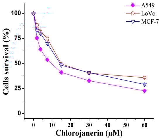 Cytotoxic effects of chlorojanerin on the viability of different human cancer cells measured by MTT assay. Cells were treated with various chlorojanerin concentrations (0–60 µM) for 24 h. Results are the mean ± S.D. from three separate experiments.