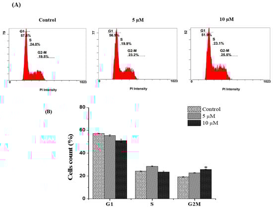 To clarify whether cell growth inhibition by chlorojanerin involves cell cycle changes, flow cytometry analysis was employed to examine the cell cycle phase distribution. A cell cycle analysis of chlorojanerin-treated A549 cells at 5 and 10 µM for 24 h revealed a remarkable concentration-dependent accumulation of A549 cells in the G2/M phase (increased to 22.85 ± 0.2% and 25.75 ± 0.35%, respectively) compared to the control (19.25 ± 0.35%). Simultaneously, chlorojanerin induced a notable reduction in cells in the G1 phase of the cell cycle (Figure 2). Our results suggested that chlorojanerin inhibited the cell cycle progression by inhibiting cells at the G2/M phase, which confirms the growth inhibition effect of chlorojanerin in A549 cells.