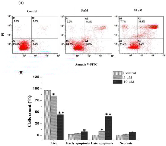 Effect of chlorojanerin on the apoptosis induction of A549 cells. A549 cells were treated with chlorojanerin for 24 h at 5 and 10 μM. (A) Annexin V-PI double staining histogram showing cell apoptosis. (B) Quantitative data of live, early and apoptotic cells and necrotic apoptotic cells. * p < 0.05; ** p < 0.01 vs untreated control.