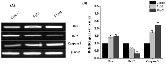 After chlorojanerin treatment (5 and 10 μM), total RNA was isolated from treated and untreated A549 cells using Trizol reagent (Invitrogen, USA) according to the manufacturer’s instructions. Reverse transcription was performed using total RNA with the Super Script VILO cDNA Synthesis Kit (Invitrogen, Waltham, MA, USA) using an equal amount of RNA (1 µg) in a final volume of 20 µL. The cDNA produced was utilized to assess the mRNA expression of apoptotic genes (Bax, Bcl-2 and caspase-3) using a specific primer for each gene while the β-gene was employed as a reference gene. The amplification RT-PCR products were electrophoresed on a 1.2% agarose gel containing ethidium bromide, and the gel was photographed using a Licor device (Licor, NE, USA).