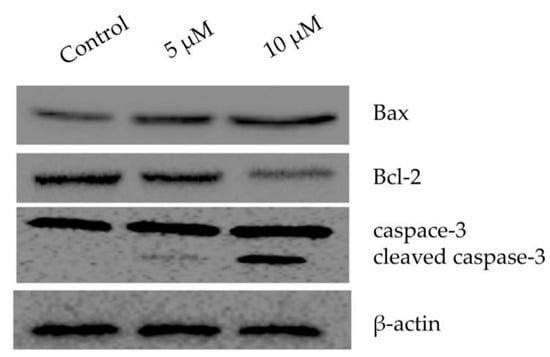 As described before [21], a Western blot analysis was carried out to explore the impact of chlorojanerin on the apoptosis linked proteins. In brief, after exposure to chlorojanerin at 5 and 10 μM concentrations, proteins were extracted out from the treated and untreated A549 cells by using RIPA lysis buffer (Thermo Scientific, Waltham, MA, USA). The lysates were centrifuged at 13,000× g for 15 min at 4 °C and the supernatant were collected in a different Eppendorf tube. Equal concentration of protein was loaded on 12% SDS-PAGE, which was further followed by transferring of protein onto polyvinylidene disulfide (PVDF) membrane (Bio-Rad, Hercules, CA, USA). The membrane was incubated with the primary antibody (Bax, Bcl-2, caspase-3 and β-actin) for an overnight period at 4 °C after blocking with 5% BSA (Bovine serum Albumin) for an hour at room temperature. Binding of an HRP-conjugated secondary antibody was carried out the next day for an hour at room temperature. Using ECL reagent (GE Health care), the membranes were made visible, and pictures were taken using a Bio-Rad gel imaging device. To confirm equal loading across lanes, the membrane was stained for β-actin.