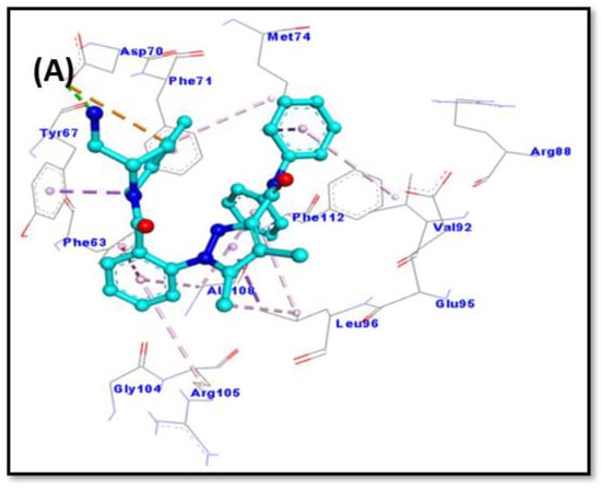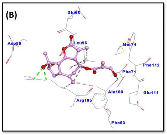 The analysis of molecular docking results suggests that chlorojanerin and DRO occupied a common position at the active site of Bcl-2 (Table 2, Figure 7). In DRO-Bcl-2 complex, a hydrogen bond between N-atom of DRO and OD2-atom of ASP70 along with an electrostatic interaction between DRO and ASP70:OD2 residue of Bcl-2 were the driving forces that stabilize the whole complex (Figure 8A). DRO also formed three π-σ hydrophobic interactions with MET74: CE, LEU96:CD1, and TYR67. In addition, DRO interacted with Bcl-2 through two π-π T-shaped hydrophobic interactions (with PHE63 and PHE71), and one Alkyl hydrophobic interaction with LEU96. Moreover, ARG105, ALA108, MET74, and VAL92 were engaged in forming π-alkyl hydrophobic interactions with Bcl-2 (Table 2). Further, some residues of Bcl-2 such as ARG88, GLU95, GLY104, and PHE112 were involved in van der Waals’ interaction, which in turn provide strength to the Bcl-2 and DRO complex. Similarly, an in-depth analysis of chlorojanerin and Bcl-2 complex formation indicates that there were three hydrogen bonds with Arg105: HE, ARG105:HH21, and ALA108:O responsible for the formation of a stable protein–ligand complex (Figure 8B). In addition, it also formed four Alkyl hydrophobic interactions (with LEU96, ARG105, and ALA108), and one π-alkyl hydrophobic interaction with LEU96 (Table 2). In addition, chlorojanerin formed van der Waals’ interactions with PHE63, PHE71, MET74, GLU95, ASP99, GLU111, and PHE112 to further strengthen the protein–ligand interaction (Table 2 and Figure 8B). Comparatively, the binding energies of DRO and chlorojanerin towards Bcl-2 were estimated to be −10.2 kcal mol−1 corresponding to binding affinity of 3.03 × 107 M−1, and −6.5 kcal mol−1 corresponding to binding affinity of 5.85 × 104 M−1, respectively (Table 1). Interestingly, PHE63, PHE71, MET74, GLU95, LEU96, ARG105, ALA108 and PHE112 residues of Bcl-2 were commonly involved in the interaction with both chlorojanerin and DRO (control ligand).