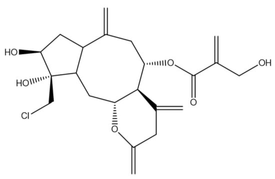 Chlorojanerin (a guaianolide-type sesquiterpene lactone) was previously isolated from several species of the Centaurea genus including Centaurea hermannii [12], Centaurea musimomum [13], Centaurea solstitialis [14], as well as Centaurothamnus maximus [10]. The biological studies of chlorojanerin have revealed that it possesses various effects such as anti-ulcerogenic [14], anti-inflammatory [15] and antiviral and antimicrobial activities [16]. Additionally, chlorojanerin has showed promising effectiveness in preventing the growth of various cancer cells [10,17]. However, there have been no previous reports regarding its molecular events associated with cell death. Herein, chlorojanerin was isolated from C. maximus and its antiproliferative effect was studied. In the following, we have demonstrated for the first time that chlorojanerin mediates cell cycle arrest and induces apoptosis in A549 lung cancer cells.
