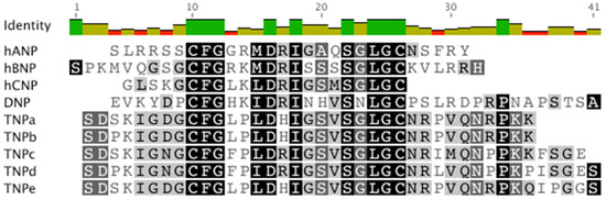 In the present study, we focus on five NPs from the venom of the inland taipan, Oxyuranus microlepidotus designated TNPa-e (Figure 1). Their sequences have been previously determined either from sequencing purified peptide from whole venoms [35] or cDNA isolation and subsequent sequencing [36]. Interestingly, TNPd was predicted from a single transcript from three related species including Oxyuranus scutellatus (coastal taipan), O. microlepidotus and Pseudechis australis (mulga snake) though not observed at the peptide level in the venom of the inland taipan. Prior research demonstrated that TNPa, TNPb and TNPc possess natriuretic activity in rat tissues [35] but their cGMP-stimulating activity was not investigated. This research characterizes TNPa-e activity at both human and rat NPR-A, evaluates their cardiovascular effects in rabbit models, and analyzes the structural features of TNPc.