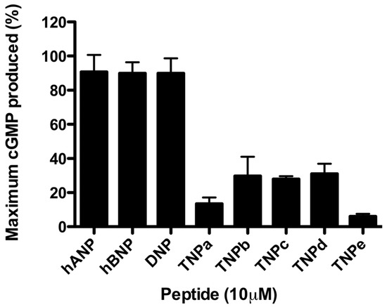 In contrast to their activity at rNPR-A, TNPa-e did not significantly stimulate cGMP production through hNPR-A (Figure 3). At 10 μM, TNPb, TNPc, and TNPd caused ~30% of the maximum cGMP production compared with the responses to DNP, hANP, and hBNP. cGMP production in response to TNPa and TNPe was less than 20% of the maximum response. As a result of the low potencies, full concentration–response curves were unable to be produced.