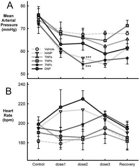 Average mean arterial blood pressure (mmHg, panel (A)) and heart rate (bpm, beats per minute, panel (B)), before (control) and after three infusions of vehicle (n = 10), hANP (n = 8), TNPa-c (n = 5), and DNP (n = 5). The doses of peptides were 1, 2, and 4 µg/kg/min for 45 min followed by a recovery period of 1 h from stopping the infusion. Error bars are SEM. *** p < 0.001 compared to vehicle based on the average effect of the dose.