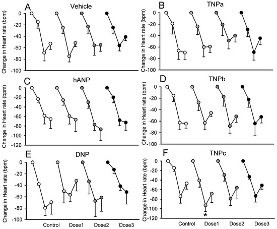 Average changes in heart rate from baseline to bolus injections of 5-hydroxytryptamine before and during infusion of three doses (dose1, dose 2, and dose 3) of TNPa,b,c (panel (B,D,F) respectively), hANP (panel (C)), DNP (panel (E)), or vehicle (panel (A)) in conscious rabbits. The change in heart rate is the response to three bolus injections of 5-hydroxytryptamine (3, 10, and 30 mg/kg i.v. data points shown for each dose). Error bars are the SE of the difference from baseline. * p < 0.05 for comparison of the average response during peptide infusion compared to the average response during control.