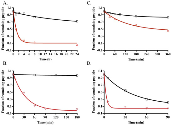 Comparative stability of TNPc (black square) and hANP (red triangle). Stability curves to human plasma (A), NEP (B), pepsin (C), and plasmin (D) were generated from RP-HPLC peak height of the remaining peptides after incubation.
