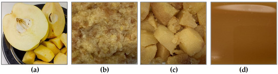 Quince fruit from a Polish farm (located in the Świętokrzyskie Voivodship), harvested in the autumn of 2021, was used for the study. The fruit was stored in refrigerated conditions (10 °C and a relative humidity of 85%) until the tests were carried out. For this study, 20 pieces of fruit of a similar weight (average 218.0 ± 17.6 g) were selected. The fruit was cleaned, washed, dried, peeled, deseeded, diced to a size of approximately 2 × 2 cm, divided into three parts, and subjected to cooking, frying in a pan without fat, and juicing to obtain juice.