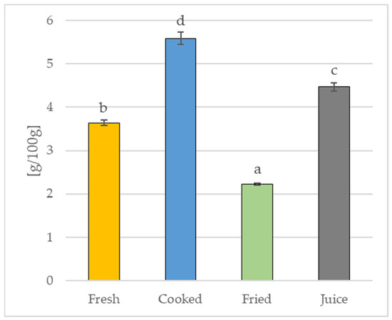 The sum of determined carotenoids (Figure 3a) ranged from 44.98 ± 0.18 mg/100 g of the product (in the case of fresh fruit) to 166.12 ± 0.62 mg/100 g in fried fruit. The heat-treated fruits, i.e., the boiled and fried fruits, did not differ in terms of the sum of determined carotenoids (average 165.53 ± 1.13 mg/100 g), unlike the freshly squeezed quince fruit juice (141.88 ± 0.62 mg/100 g).