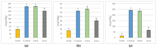 Regarding the determined phenolic acids (Figure 3c), the sum of these compounds ranged from 16.88 ± 0.16 mg/100 g of the product (fresh) to 242.97 ± 1.25 mg/100 g (cooked), whereas the quince subjected to heat treatment (fried and boiled) did not differ from each other (average 239.22 ± 4.38 mg/100 g). The quince fruit juice contained a significantly lower (over 3.5 times) content of total phenolic acids (66.18 ± 1.49 mg/100 g) compared to the heat-treated fruit.