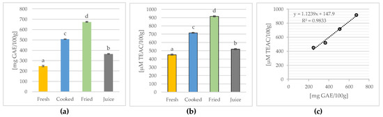 It should be emphasized that such a tendency was observed not only for the total polyphenols (Figure 4a), but also for the sum of the carotenoids (Figure 3a), flavonoids (Figure 3b), or phenolic acids (Figure 3c) identified by HPLC assay. It is also worth noting that for the sum of the determined carotenoids and phenolic acids, no significant differences were found between cooking and frying, but a significantly higher total flavonoid content was found in the fried fruits compared to the boiled ones, similar to the total polyphenols (Figure 4a) or antioxidant activity (Figure 4b).