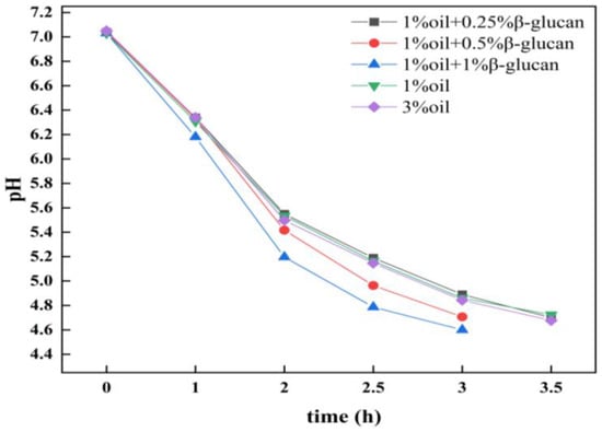 Figure 1 shows the effect of oat β-glucan on the fermentation characteristics of low-fat pea protein yogurt. It indicates that, in the absence of oat β-glucan, the fermentation curves of pea protein yogurt prepared with 1% and 3% oil were similar. After 3.5 h of fermentation, their pH values were still higher than the target endpoint (pH 4.6).