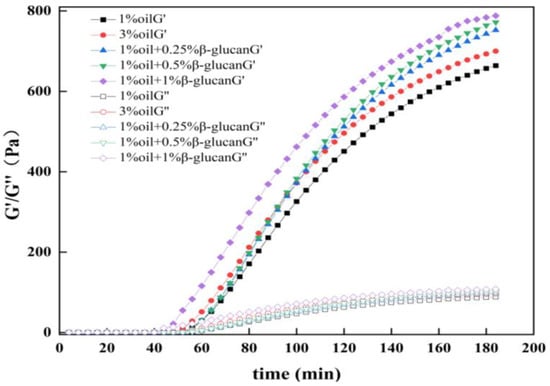 Rheology was employed to observe the formation of gel in yogurt. In general, storage modulus (G′) and loss modulus (G″) represented the elastic behavior and viscous behavior of the sample, respectively [21]. As shown in Figure 2, the G′ and G″ values of the yogurt samples increased dramatically after around 40 min of fermentation, and all the G′ values were much higher than the G″ values, exhibiting a typical characteristic of yogurt gel. The fat content was an essential factor in the elasticity of the yogurt, and the reduction of the oil content from 3% to 1% decreased the elasticity of the pea protein yogurt, which was attributed to the weakening of the interactions between oil droplets and protein. The elasticity of yogurt containing oat β-glucan was much higher than that prepared with 3% oil. Additionally, as the concentration of oat β-glucan increased, the elasticity of yogurt was also enhanced. The reason, probably, was that the interaction between pea protein and oat β-glucan was enhanced, which was beneficial to improve the elastic properties of yogurt. The results were consistent with the studies of defatted walnut meal flour/oat β-glucan mixture and silver carp surimi/oat β-glucan mixture [25,26].