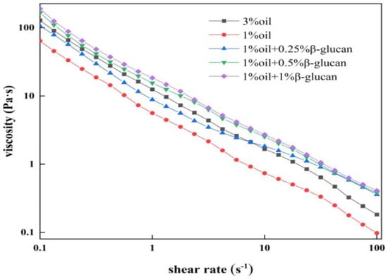 The apparent viscosity of all yogurt samples decreased with shear rate (Figure 3), indicating a typically shear-thinning fluid behavior [27]. In the absence of oat β-glucan, pea protein yogurt prepared with 1% oil had the lowest apparent viscosity and was positively correlated to the oat β-glucan concentration. According to Figure 2, it was reasonable to assume that the gel structure in the pea protein yogurt could withstand higher shear force, and the three-dimensional network structure became more stable by adding oat β-glucan. Similarly, the addition of inulin to yogurt sharply increased the viscosity of the yogurt [28]. Raikos et al. [29] concluded that hydrophilic polysaccharides had good hydration ability, so water could be locked in the three-dimensional structure, which improved the viscosity of yogurt.