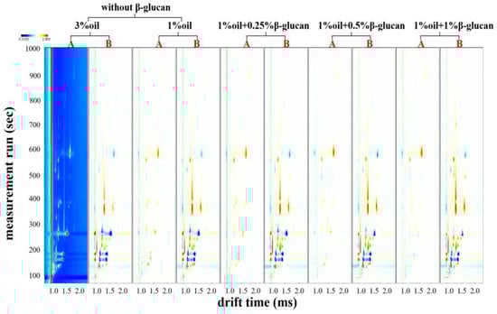 Gas chromatography–ion mobility spectrometry (GC-IMS) is a novel analytical technique operated at ambient pressure and temperature. It has the advantages of low detection limit, good selectivity and miniaturization [34,35]. In addition, this method can effectively and intuitively display the differences among samples in color-contour images [36]. Figure 5 reflects the effects of oat β-glucan on VOCs in pea protein yogurt before and after fermentation. When 3% oil was used as a background reference against other sample spectra, other samples had more or fewer red and blue spots in their spectra. The red spots showed that the concentration of VOCs was higher than the control, but the blue spots showed the opposite result. From Figure 5, it could be seen that VOCs content in all samples after fermentation was significantly higher than that before fermentation; thus, fermentation facilitated the formation and accumulation of VOCs. Yang et al. [21] also found that VOCs content in pea protein yogurt and mug bean protein yogurt increased after fermentation.