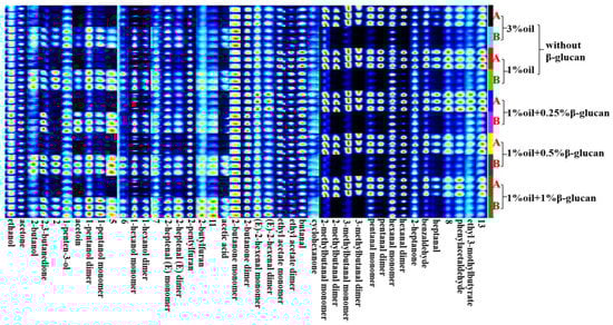 The fingerprints of low-fat pea-protein-based yogurt with different levels of oat β-glucan before and after fermentation: A and B represent the samples with or without fermentation, respectively.