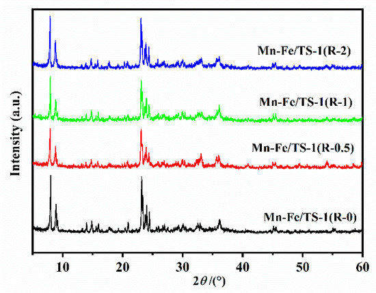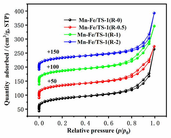 The N2 adsorption–desorption isotherms of Mn–Fe/TS-1(R-0), Mn–Fe/TS-1(R-0.5), Mn–Fe/TS-1(R-1), and Mn–Fe/TS-1(R-2) are presented in Figure 3 and the textural properties of the catalysts are presented in Table 1. All of the Mn–Fe/TS-1(R-x) samples displayed standard type I isotherms in the relative pressures of p/p0 < 0.01, indicating that the samples have microporous structure. Meanwhile, an uptake in the relative pressures of 0.60 < p/p0 < 1.0 can be observed due to the intercrystalline mesopores, which is typical of the nanocrystal structure of TS-1 [27]. The hierarchical structure of the samples is conducive to enhancing the diffusion of reactant and product molecules [28]. Moreover, the Mn–Fe/TS-1(R-2) catalyst displays a higher content of active metal components (3.9 wt% Mn and 4.9 wt% Fe) than Mn–Fe/TS-1(R-0, 0.5 wt% Mn and 2 wt% Fe), which demonstrates that the suitable addition of TEPA is conducive to increasing a number of active components. Significantly, high levels of Mn and Fe in Mn–Fe/TiO2 prepared by the impregnation method can be observed, which promote most of the active ingredient loaded on the support and reduce the level of the active ingredient dispersion.