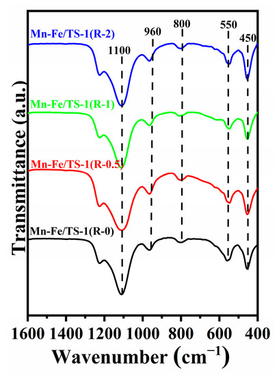 The FT−IR spectra of Mn–Fe/TS-1(R-0), Mn–Fe/TS-1(R-0.5), Mn–Fe/TS-1(R-1), and Mn–Fe/TS-1(R-2) are shown in Figure 2. All samples display infrared peaks at 1100, 960, 800, 550, and 450 cm−1. The band at 550 cm−1 is assigned to the vibration of the double five-membered ring unit and demonstrates the formation of MFI structure. The bands at 800 and 1100 cm−1 are attributed to the symmetrical and antisymmetrical stretching vibrations of Si–O–Si bonds, respectively. The band at 960 cm−1 has been used as evidence of the isomorphous substitution of Ti in the TS-1 framework [24]. Moreover, the intensity ratio of the bands at 550 and 450 cm−1 (I550/I450) has been often used to evaluate the crystallinity of MFI zeolite, which is termed as the FTIR crystallinity [25,26]. The I550/I450 ratios for the Mn–Fe/TS-1(R-0), Mn–Fe/TS-1(R-0.5), Mn–Fe/TS-1(R-1), and Mn–Fe/TS-1(R-2) are 0.66, 0.52, 0.59, and 0.54, respectively, demonstrating that Mn–Fe/TS-1 synthesized using TEPA as a metal complexing agent has low crystallinity, which is in good agreement with the XRD results.