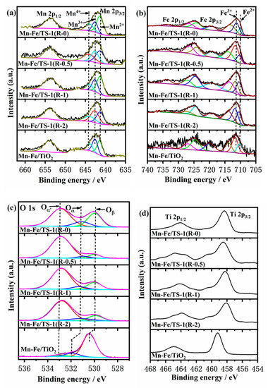 The surface composition and chemical state of Mn, Fe, O, and Ti of the different catalysts were characterized by XPS (Figure 5). As shown in Figure 5a, the Mn 2p XPS spectra exhibit two main peaks, associated with Mn 2p1/2 (~653 eV) and Mn 2p3/2 (~642 eV). The Mn 2p3/2 spectra of the catalysts are de-convoluted into oxidation states of Mn2+, Mn3+, and Mn4+ which are observed at 641.3, 642.5, and 644.2 eV, respectively. Moreover, the relative ratios of Mn4+/Mnsuf for all the catalysts were calculated and the results are listed in Table 2. The Mn4+/Mnsuf values of Mn–Fe/TS-1(R-0.5) and Mn–Fe/TS-1(R-2) are significantly higher than that of others. Combined with the denitration results of the catalysts, the greater Mn4+ can accelerate the transformation of NO to NO2 and further promote the occurrence of a “fast SCR” reaction [30].