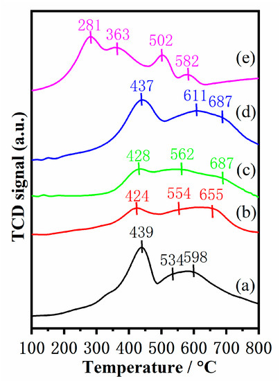 The reducibility of catalysts closely correlates with the catalytic performance of the NH3-SCR reaction. Hence, H2-TPR experiments were carried out to characterize the reducibility of the catalysts and the result are displayed in Figure 6. The H2 consumption peaks are observed from 100 to 800 °C in all catalysts, which are related to the reduction process of MnOx and FeOx. Mn–Fe/TiO2 catalyst exhibits four obvious reduction peaks. The first peak at low temperatures (~281 °C) is assigned to the reduction of MnO2 to Mn2O3. The second reduction peak at around 363 °C is attributed to the reduction of Mn2O3 to Mn3O4 and Fe2O3 to Fe3O4. This reduction process is more liable to happen over reducible sites in the form of oligomeric clusters, nanoparticles, or isolated ions, while residual Mn2O3 and Fe2O3 reducing to MnO and Fe3O4 mostly occurs at relatively higher temperatures (Peak 3, 502 °C). The fourth reduction peak at high temperatures (~582 °C) belongs to the overlapping peak of Mn3O4→MnO and Fe3O4→FeO [33]. The results indicate that most Fe2O3 is reduced at lower temperatures (~363 °C), while only small amounts of remaining Fe2O3 are reduced to Fe3O4 at higher temperatures. Three obvious reduction peaks are observed in the Mn–Fe/TS-1(R-x) catalysts. The reduction peaks at around 430 °C could be ascribed to the stepwise reduction of MnO2 and Fe2O3 (MnO2→Mn2O3, Mn2O3→Mn3O4, and Fe2O3→ FeO). The reduction peak located at 530–610 °C is associated with the reduction of Mn3O4, while the high-temperature reduction peaks (590–690 °C) are related to the reduction of FeO [34]. When Si species were introduced into the TiO2 support, H2 consumption of the Mn–Fe/TS-1(R-x) catalysts was larger than that of the Mn–Fe/TiO2 catalyst (Table 3). It is worth noting that the Mn–Fe/TS-1(R-2) catalyst displays higher H2 consumption than the others, indicating that it possesses enhanced redox properties. The improved reducibility is beneficial to promote the NH3-SCR reaction.