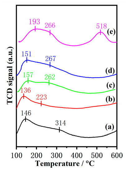 Nitrogen oxides (NOx) are associated with a host of environmental issues, such as acid rain, haze, and photochemical smog, which severely endanger public health [1,2]. Selective catalytic reduction of nitrogen oxides with ammonia (NH3-SCR) is a crucial method to effectively control NOx emission [3,4]. Presently, the commercial V2O5–WO3/TiO2 (VWTi) catalyst is employed extensively for controlling NOx emissions. However, there are still many problems in the practical application of the VWTi catalyst, such as narrow temperature windows, poor high-temperature stability, the poisonousness of V2O5, and so on [5,6]. Accordingly, numerous studies have been devoted to exploiting vanadium-free NH3-SCR catalysts in recent years.