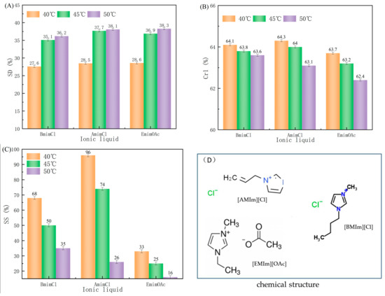 Effects of different species of ionic liquids on (A) swelling degree, (B) crystallinity degree, and (C) swelling selectivity of MCC. (D) Chemical structures of the three ionic liquids.