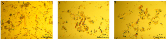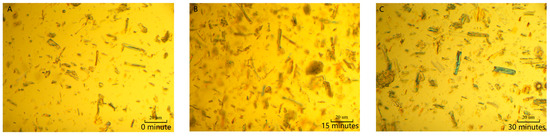 The morphology of MCC was observed by polarizing microscope (Jiangnan Yongxin NP-800RF/TRF, Ningbo, China) after being swollen in the [AMIm][Cl] for varying residence times. The weakened hydrogen-bonding network of the amorphous region of cellulose made it more susceptible to attack by [AMIm][Cl], resulting in an increase in its size. Polarizing microscopy analysis indicated that the width of MCC increased with the extension of swelling time (Figure 2).