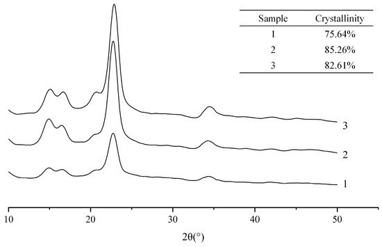 where I200 is the peak intensity of the main crystalline plane (200) diffraction at 22.8°, and Iam is the diffraction intensity of the amorphous domain of cellulose at 18.0°.