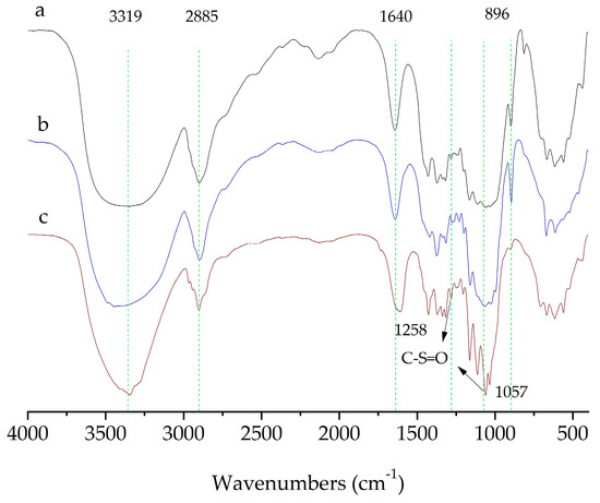 Two special weak absorption bands at 1057 cm−1 and 1258 cm−1 were found on CNCs extracted with traditional methods, indicating the presence of sulfonic acid groups, which were produced by the esterification of hydroxyl groups on cellulose and sulfuric acid. However, the CNCs isolated with swelling-SA-catalyzed hydrolysis method keep a typical spectrum of cellulose structure, and no characteristic absorption of sulfonic acid was observed in the product.