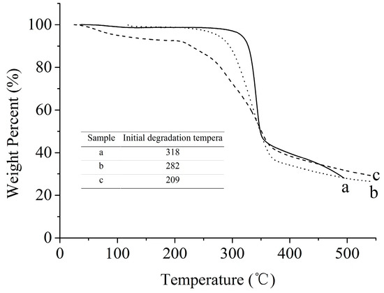 TGA analysis of a: the original MCC, b: the CNCs extracted with swelling−SA−catalyzed hydrolysis method at 45 °C for 5 h, and c: the extracted CNCs hydrolyzed in 65.0 wt% H2SO4 at 45 °C for 5 h.