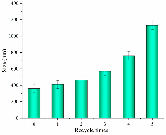 Considering the environmental protection and technical application, the recycling of acid is very important. Figure 9 showed that the recycled solid acid was reused for the extraction of CNCs up to five times via the same acidolysis process, with the lengths of the extracted CNCs measured each time. The results indicated that the length of CNCs increased progressively with the increasing number of recycles, suggesting a decrease in the acidolysis ability of the solid acid upon reuse. After the fourth and fifth cycle of reuse, the solid acid exhibited a significant decrease in acidity, resulting in an increase in the length of CNCs to over 800 nm and 1000 nm, respectively, exceeding the nanocellulose category. The decreased hydrolytic activity of recycled solid acid may be due to the adsorption of fiber-degrading components on its surface active sites during the recycling process. Ultrasonic conditioning was applied for surface cleaning to restore the hydrolytic activity of the solid acid, resulting in a reduction of the CNCs length to 720 nm after the fifth recycling cycle. Solid acids could be recycled up to three times without the surface cleaning.