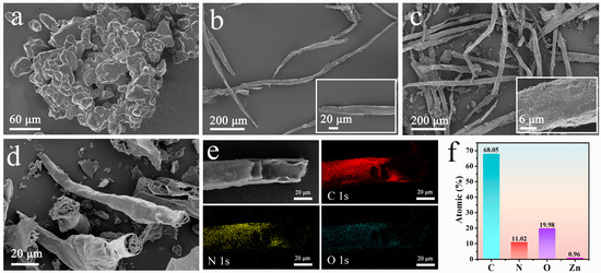 Figure 1 is a schematic diagram of the preparation of CWFZs. While ZIF-8 provides a porous network, WF, with a large number of active functional groups on the surface, is used as a mechanical support to build a new type of composite material. In the first step, WF with a relatively smooth surface (Figure 2b) was immersed in an aqueous solution containing zinc nitrate, and the abundant hydroxyl and carboxyl groups on the WF’ surface anchored the zinc ions through electrostatic adsorption. Subsequently, the WFs loaded with zinc ions were added to the dimethylimidazole solution for in situ growth, and the ZIF-8 coating layer was formed by heterogeneous nucleation on the WF’s surface. Figure 2c shows that ZIF-8 is uniformly dispersed on the fiber surface, effectively avoiding the agglomeration of ZIF-8 nanoparticles (Figure 2a). The core-shell carbon fibers (Figure 2d) were obtained from high-temperature calcination, and ZIF-8 was pyrolyzed into N-doped carbon. More detailed synthetic procedures are provided in the Methods section. Furthermore, as shown in Figure 2e, the energy dispersive spectroscopy (EDS) mapping analysis indicated that the C, N, and O elements were uniformly distributed on the WF’ surface. Figure 2f shows the element content of CWFZ2. The trace amount of remaining Zn atoms in it can be ignored. A high content of N-doping can promote the electrochemical performance of carbon electrode materials.