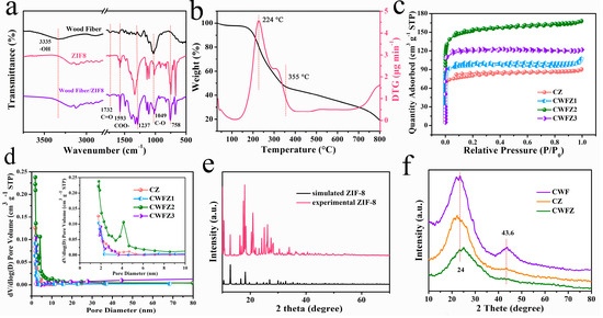 (a) FTIR patterns of WF, ZIF-8, and WFZ; (b) TG and DTG curves of WFZ; (c) N2 adsorption-desorption isotherm and (d) the pore size distribution of CZ and CWFZ2; (e,f) XRD patterns of different samples.