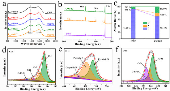 The crystallographic structures of the different samples were characterized using XRD measurements. The spectrum of the ZIF-8 synthesized in this experiment correlates with the simulated crystal structure spectrum previously published in Figure 3e. The diffraction peaks of ZIF8 appeared at 7.5°, 10.5°, 12.7°, 14.8°, 16.8°, 18.1°, and 19.3°. After the calcinations (Figure 3f), all the diffraction peaks of ZIF-8 disappeared, and two characteristic peaks appeared at 24.0° and 43.6°, corresponding to (002) and (100) crystallographic planes of disordered and amorphous carbon, indicating that the ZIF-8 nanoparticles were transformed into carbon nanoparticles [27,28,29]. No diffraction peaks for Zn impurities and other diffraction peaks for ZIF-8 are observed in the PCs. In order to better study the properties of the carbon materials, Raman tests were conducted on the different samples (Figure 4a). Two peaks appeared at 1352 cm−1 and 1589 cm−1 in all the samples, corresponding to defect regions (D-band) and ordered carbon (G-band), respectively. Overall, the intensity ratio of the D-band to the G-band (ID/IG) can confirm the defect density of carbon [30]. It can be seen that the ID/IG values of CWFZs are lower than CWF (0.958) and CZ (0.873), indicating that there are fewer disordered regions, which is beneficial for energy storage [31].