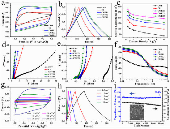 (a) CV curves of different electrodes at a scan rate of 100 mV s−1; (b) GCD curves of different electrodes at a current density of 5 mA cm−2; (c) specific capacitance of different electrodes; (d,e) EIS curves of different electrodes; (f) Bode phase diagrams of different electrodes; (g) CV curves of CWFZ2 at different scan rates; (h) GCD curves of CWFZ2 at different current density; (i) cycle stability and a Coulomb efficiency of CWFZ2, insert map shows the SEM of CWFZ2 after electrochemical testing.